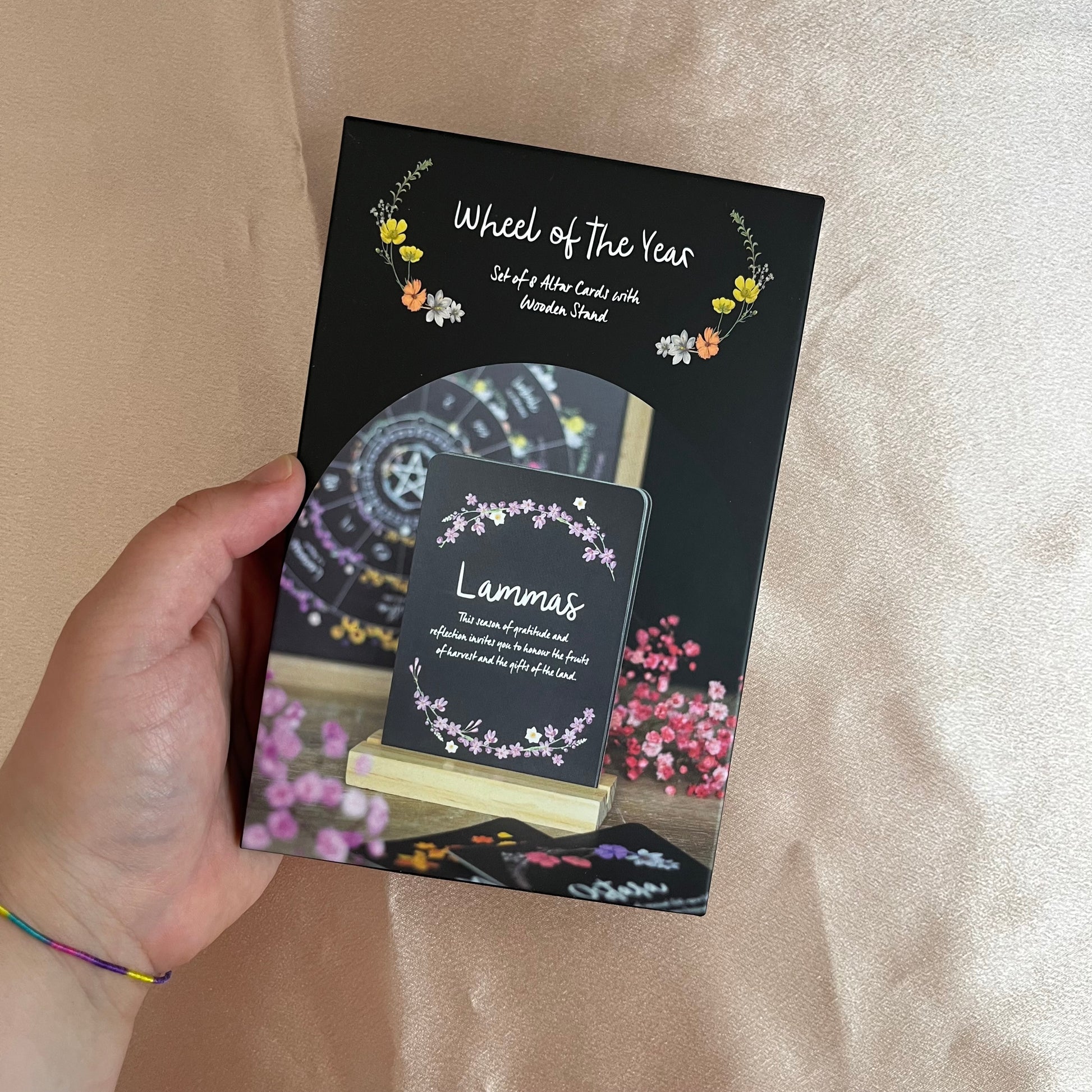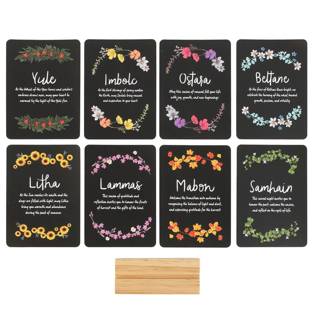 Set di 8 carte + porta carte in legno a tema Ruota dell’Anno. Ogni carta descrive un Sabba con un’affermazione tipica del periodo di riferimento. Perfette per altari, rituali o studio spirituale.